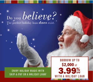 *APR= Annual Percentage Rate. Holiday Loan available Oct. 1st – Dec. 31, 2025. ** Skip a Loan Payment is valid for payments normally due in December 2025 or January 2026 only. Skip request form must be received at least five business days prior to payment due date. Not all loans are eligible for skip promotion. There is a $30 fee per eligible loan skipped.